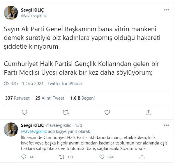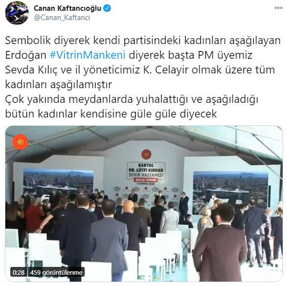 Kaftancıoğlu, "Sembolik diyerek kendi partisindeki kadınları aşağılayan Erdoğan vitrin mankeni diyerek başta PM üyemiz Sevgi Kılıç ve il yöneticimiz K. Celayir olmak üzere tüm kadınları aşağılamıştır Çok yakında meydanlarda yuhalattığı ve aşağıladığı bütün kadınlar kendisine güle güle diyecek" dedi.