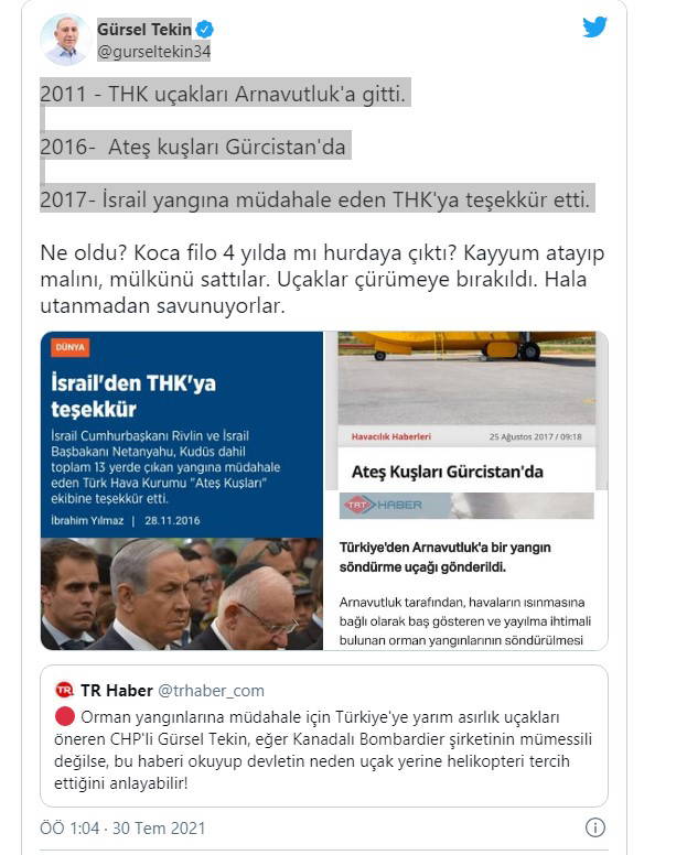 Tekin, Twitter hesabında yaptığı paylaşımda, “2011 – THK uçakları Arnavutluk’a gitti. 2016- Ateş kuşları Gürcistan’da. 2017- İsrail yangına müdahale eden THK’ya teşekkür etti. Ne oldu? Koca filo 4 yılda mı hurdaya çıktı? Kayyum atayıp malını, mülkünü sattılar. Uçaklar çürümeye bırakıldı. Hala utanmadan savunuyorlar” dedi.