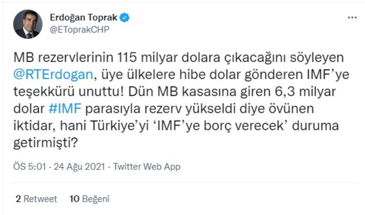 Erdoğan'ın bu yöndeki açıklamalarına CHP'li Erdoğan Toprak'tan tepki geldi. Toprak, Erdoğan'ın, "Dün MB kasasına giren 6,3 milyar dolar IMF parasıyla rezerv yükseldi" şeklinde övündüğünü ifade eti.