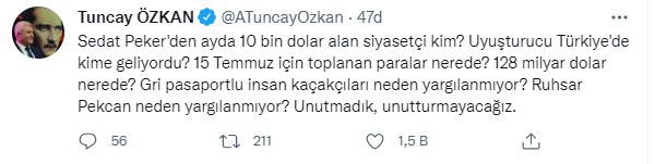 "Sedat Peker'den ayda 10 bin dolar alan siyasetçi kim? Uyuşturucu Türkiye'de kime geliyordu? 15 Temmuz için toplanan paralar nerede? 128 milyar dolar nerede? Gri pasaportlu insan kaçakçıları neden yargılanmıyor? Ruhsar Pekcan neden yargılanmıyor? Unutmadık, unutturmayacağız."