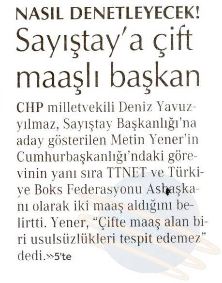 Özkan'ın paylaştığı gazete kupürüne göre Cumhurbaşkanlığı'nda Personel ve Prensipler Genel Müdürü olarak görev yapan Yener, TTNET ve Türkiye Boks Federasyonu Asbaşkanı olarak iki ayrı maaş daha alıyor.