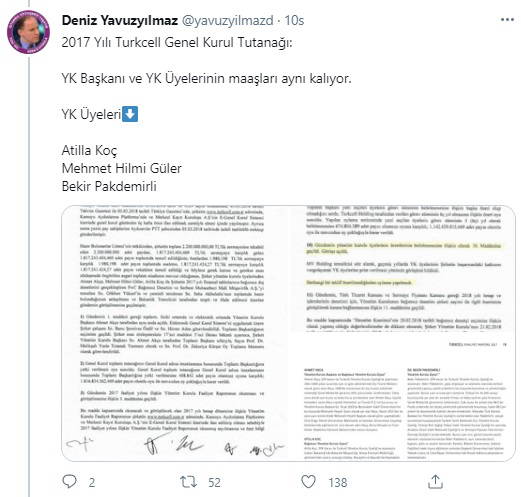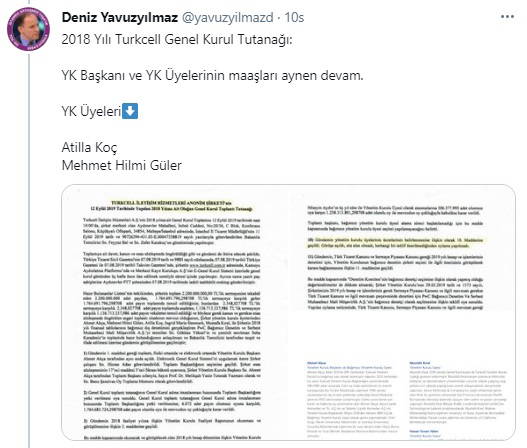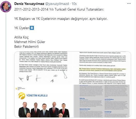 "YK Başkanı yıllık net maaşı 250.000 Avro, YK Üyelerinin yıllık net maaşları 100.000 Avro! 2010'da belirlenen bu tutar, bugüne kadar aynen devam. Kaynak: Turkcell Genel Kurul Tutanakları"