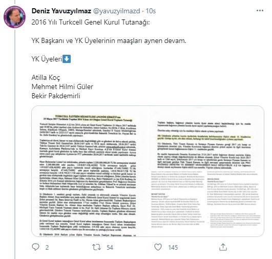 Cumhuriyet Halk Partisi Zonguldak Milletvekili Deniz Yavuzyılmaz,Türk Telekom Yönetim Kurulu Üyesi olan AKP'lilerden sonra Turkcell Yönetim Kurulu'nda görev yapan ve yıllık 100 bin avro maaş aldıkları belirtilen AKP'lileri de sosyal medya hesabından paylaştı.
