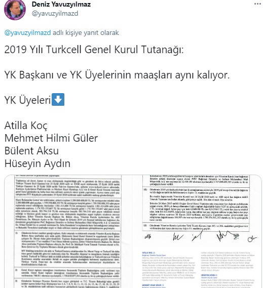 Yavuzyılmaz, "Turkcell Yönetim Kurulundaki (YK) AK Partili bürokratların maaşlarını ortaya çıkardık" başlığıyla yaptığı paylaşımda şu ifadelere yer verdi: