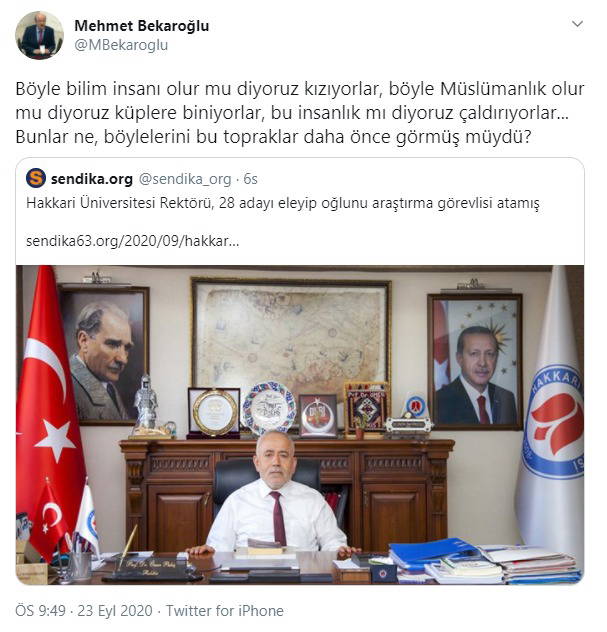 CHP İstanbul Milletvekili Mehmet Bekaroğlu, Hakkari Üniversitesi Rektörü Ömer Pakiş'in 28 adayı eleyip, kendi oğlunu araştırma görevlisi yapmasına yönelik haberi paylaşarak tepki gösterdi.