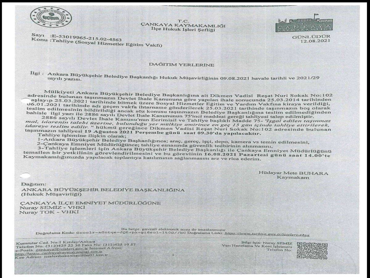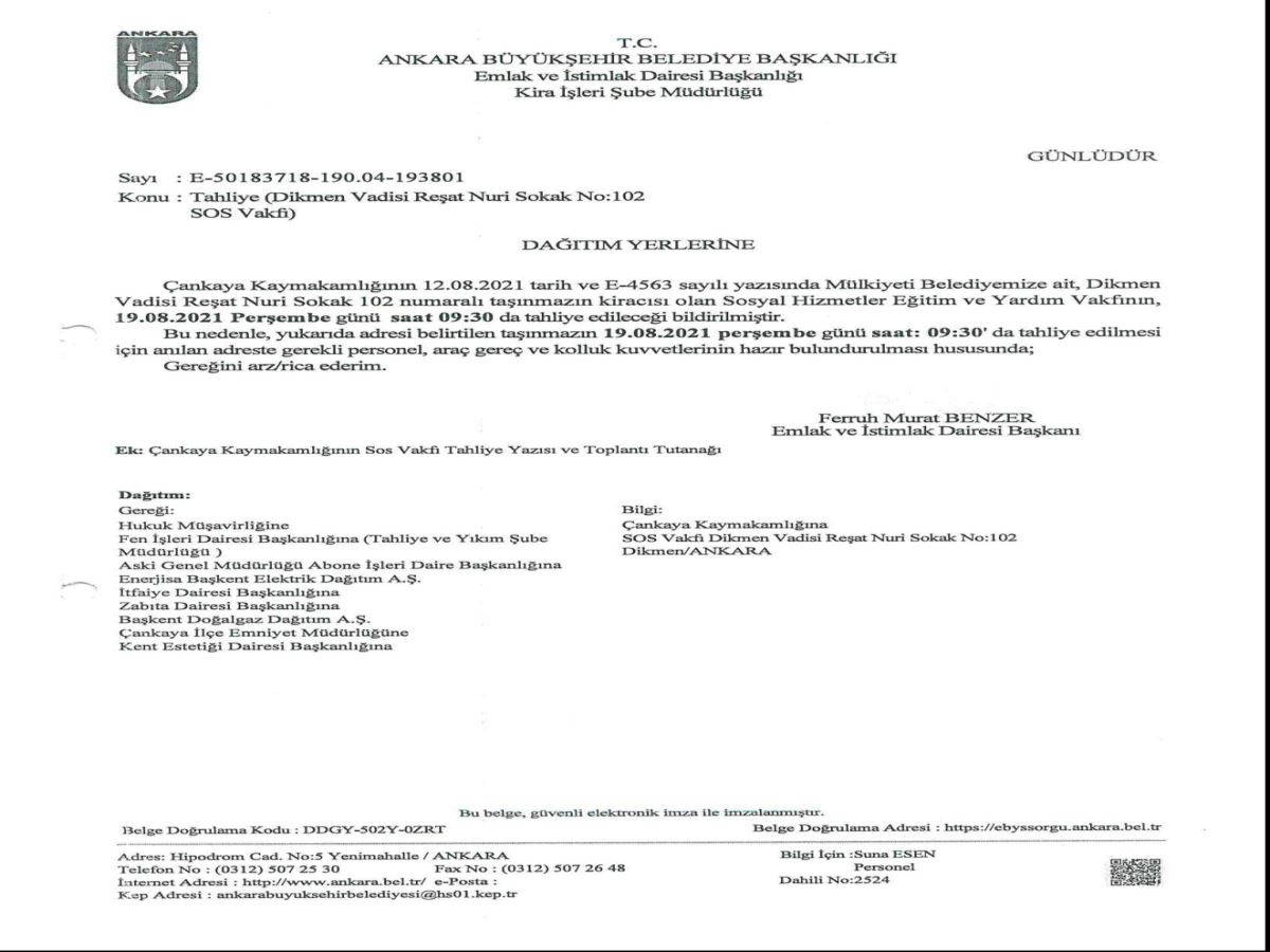 Taşçıer, yaptığı açıklamalarda Ankara Büyükşehir Belediyesi'nin Çankaya Dikmen Vadisi'ndeki bir deposunun 2014'te SOS Vakfı'na 7 yıl için kiralandığını, kiralama süresinin dolması nedeniyle tahliyesinin gerektiğini ancak kaymakamlık tarafından tahliyenin ertelendiğini aktardı. Taşçıer, tahliyenin ertelenmesinin hemen akabinde Ankara 2.İdare Mahkemesi tarafından 'tahliyenin yürütmesinin durdurulması' kararının verildiği belirtti.