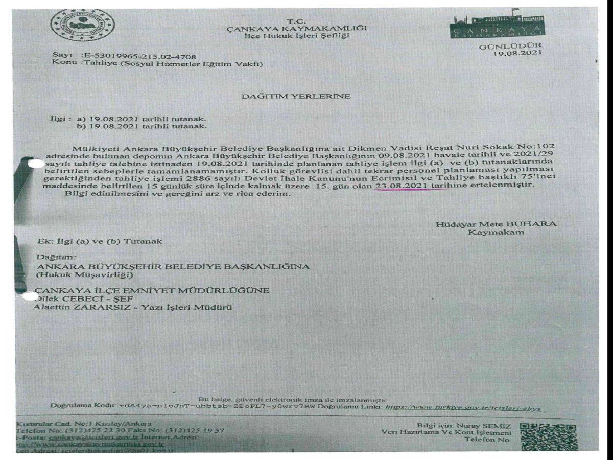 Talih bu ya, kaymakamlık tahliyeyi erteledik dedikten bir gün sonra SOS Vakfı'nın başvurusuyla Ankara 2. İdare Mahkemesi tahliyenin yürütmesini durdurma kararı alıyor. Mart ayında sözleşmesi biten depoda 5 ay süren apaçık bir işgal varken veriliyor bu karar