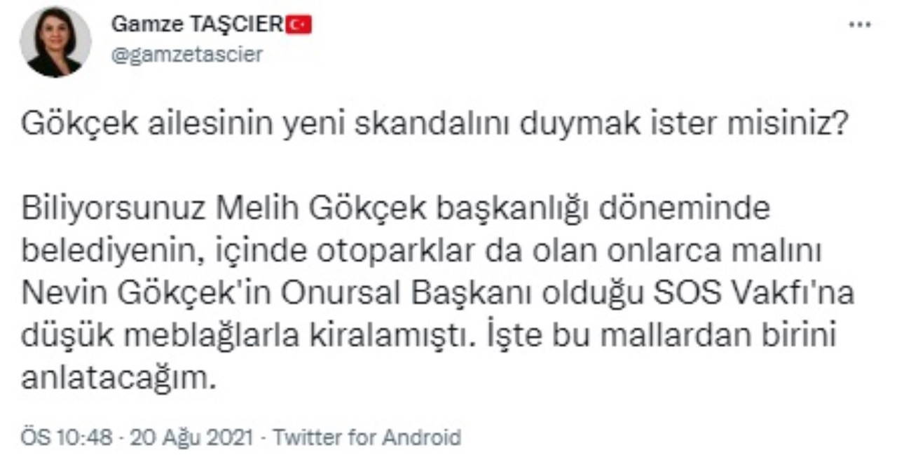 CHP Ankara Milletvekili ve PM üyesi Gamze Taşçıer, eski Ankara Büyükşehir Belediye Başkanı Melih Gökçek'e ilişkin yeni bir 'skandalı' sosyal medya hesabından paylaştı.