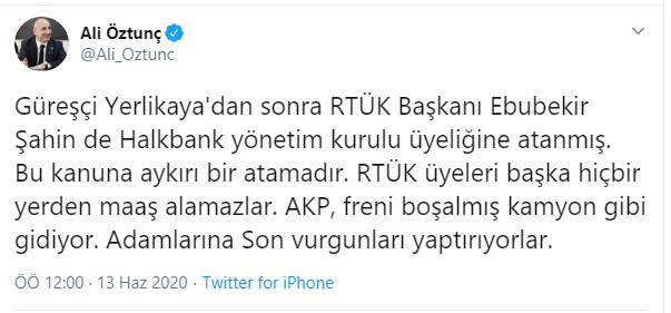 Twitter hesabından açıklamada bulunan, Öztunç, "Güreşçi Yerlikaya'dan sonra RTÜK Başkanı Ebubekir Şahin de Halkbank yönetim kurulu üyeliğine atanmış. Bu kanuna aykırı bir atamadır. RTÜK üyeleri başka hiçbir yerden maaş alamazlar. AKP, freni boşalmış kamyon gibi gidiyor. Adamlarına son vurgunları yaptırıyorlar" dedi.