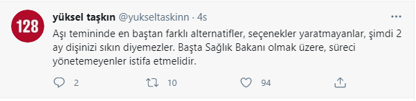 Sağlık Bakanı Fahrettin Koca'nın "Aşı tedariki önümüzdeki 2 ay için güçleşecek" açıklamasına göndermede bulunan CHP'li Yüksel Taşkın'ın paylaşımı şöyle: Aşı temininde en baştan farklı alternatifler, seçenekler yaratmayanlar, şimdi 2 ay dişinizi sıkın diyemezler. Başta Sağlık Bakanı olmak üzere, süreci yönetemeyenler istifa etmelidir.