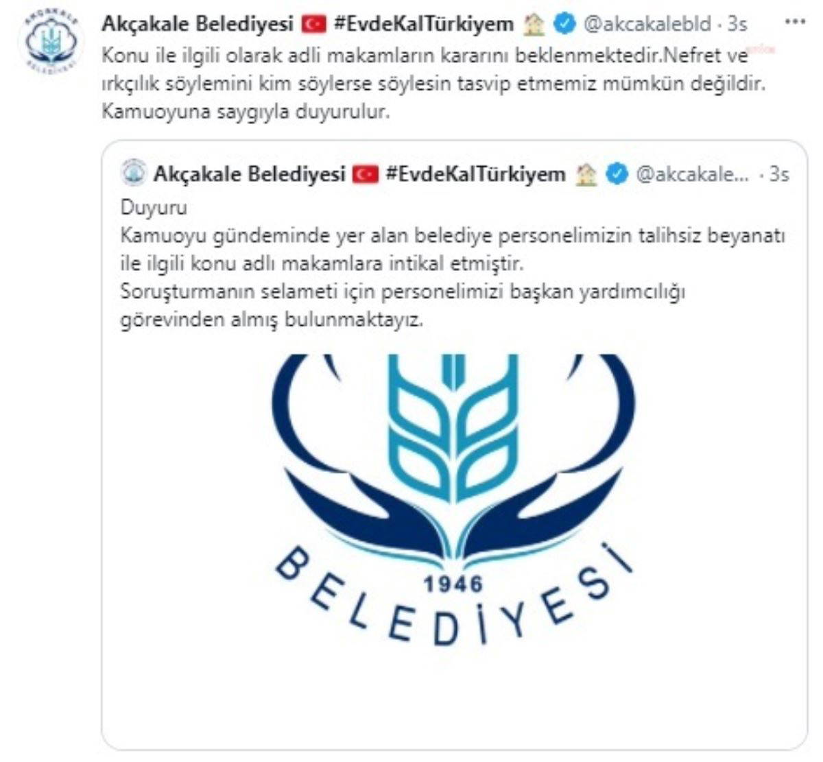 "Kamuoyu gündeminde yer alan belediye personelimizin talihsiz beyanatı ile ilgili konu adlı makamlara intikal etmiştir. Soruşturmanın selameti için personelimizi başkan yardımcılığı görevinden almış bulunmaktayız. Konu ile ilgili olarak adli makamların kararını beklenmektedir. Nefret ve ırkçılık söylemini kim söylerse söylesin tasvip etmemiz mümkün değildir."