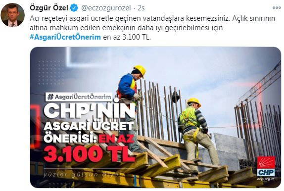 CHP Grup Başkanvekili ve Manisa Milletvekili Özgür Özel, ''Sarayın kibirlileri 5 maaş alırken ve kendi maaşlarına yüzde 20 zam yaparken salgın süresince canları pahasına çalıştırılan işçiler için emekçiler için #AsgariÜcretÖnerim en az 3 bin 100 TL''