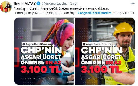 CHP Grup Başkanvekili Engin Altay, ''Yandaş müteahhitlere değil, üreten emekciye kaynak aktarın. Emekçinin yüzü biraz olsun gülsün diye #AsgariÜcretÖnerim en az 3 bin 100 TL'' ifadelerini kullandı.
