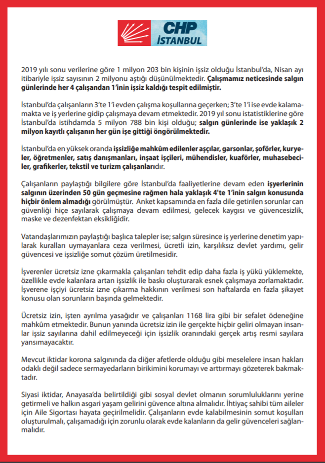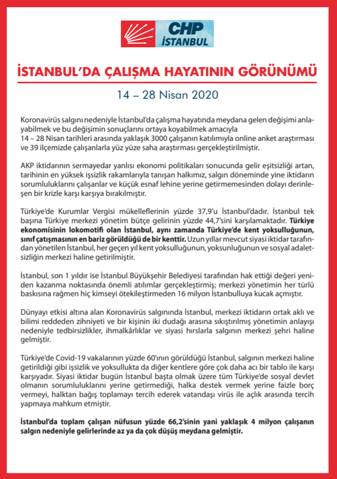 CHP İstanbul İl Başkanlığı’nın 14-28 Nisan tarihleri arasında anket araştırması ve ilçe örgütlerinin saha çalışmalarından elde edilen verilerle hazırladığı "İstanbul’da Çalışma Hayatının Görünümü" raporunda çarpıcı bilgilere yer verildi.