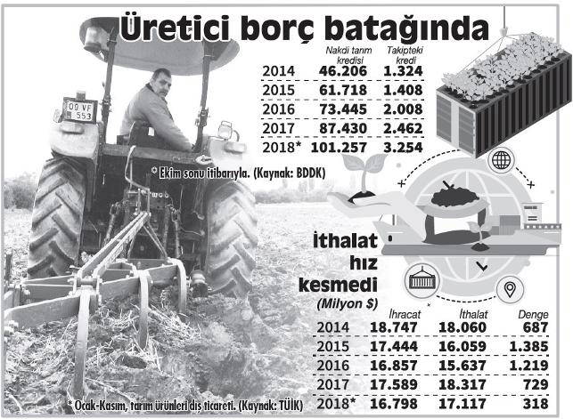 Çiftçilerin borçlarında 190 kat artış var. Ayrıca yasaya göre GSYH’nin yüzde 1’i üreticilere verilmesi gerekirken, şimdiye kadar verilen en yüksek pay 0.5. Çiftçinin devletten 155 milyar lira alacağı var. Tarım ve Orman Bakanlığı verilerine göre, Ziraat Bankası ve Tarım Kredi Kooperatifleri tarafından 2017’de toplam 41.2 milyar lira, 2018’in 9 aylık döneminde ise 29.3 milyar lira tarımsal kredi kullandırıldı. Tarım Kredi Kooperatifleri tarafından 2017’de yaklaşık 600 bin ortağa kredi kullandırıldı. Bu ortakların 6 bin 867’si hakkında icra takibi başlatıldı.