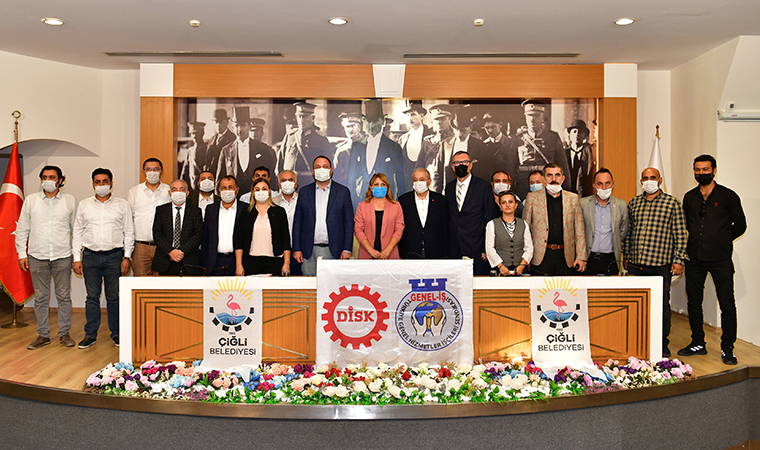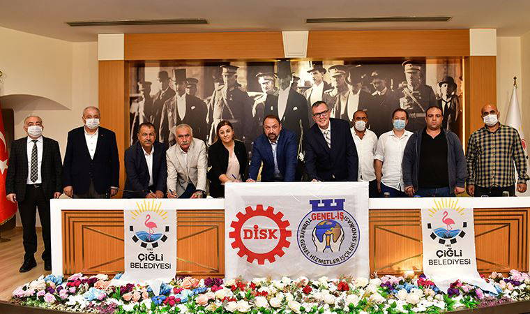 Çiğli Belediyesi’nin kadrolu işçilerini ilgilendiren TİS, Çiğli Belediye Başkanı Utku Gümrükçü, Genel-İş Sendikası Genel Sekreteri Şükret Sevgener, DİSK Ege Bölge Temsilcisi Memiş Sarı, Genel-İş Sendikası 8 Nolu Şube Başkanı Deniz Şahin Gümüştekin tarafından belediye meclis salonunda düzenlenen törenle imzalandı. Sözleşmeye göre kadrolu işçilerin ücretlerinde yüzde 14 oranında artış sağlandı.