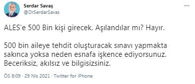 Koronavirüs salgınında yaptığı açıklamalarla dikkat çeken Dr. Serdar Savaş da sınavın ertelenmemesine tepkisini "ALES’e 500 Bin kişi girecek. Aşılandılar mı? Hayır. 500 bin aileye tehdit oluşturacak sınavı yapmakta sakınca yoksa neden esnafa işkence ediyorsunuz. Beceriksiz, akılsız ve bilgisizsiniz." diyerek dile getirdi.
