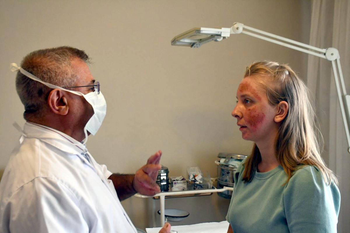 Müge Gümşar, Çorlu'da Estetik, Plastik ve Rekonstrüktif Cerrahi Op. Dr. Ali Nurhan Özbaba'ya giderek muayene oldu. Gümşar'ın yapılacak olan tedavi sonrasında yüzündeki yanıkların iyileşeceğini belirten Özbaba, "Hastamızın son durumunda yüzünden birinci ve ikinci derece yanık oluşmuş, oraya yapılan işlemle. Burada yapılması gereken şey yanık tedavisi uygulayacağız. Eğer bu tedavi düzgün uygulanırsa Müge'nin yüzünde iz kalmadan iyileşeceğini düşünüyorum. İyileşme süreci bu kabukların dökülmesi yaklaşık 10 gün daha alacaktır. Daha sonra burası kırmızı biz buna tıpta ‘eritem’ deriz, eritem olacaktır. Kırmızılıkların geçmesi bazen 2-3 ya da 6 ay sürdüğü oluyor" dedi.