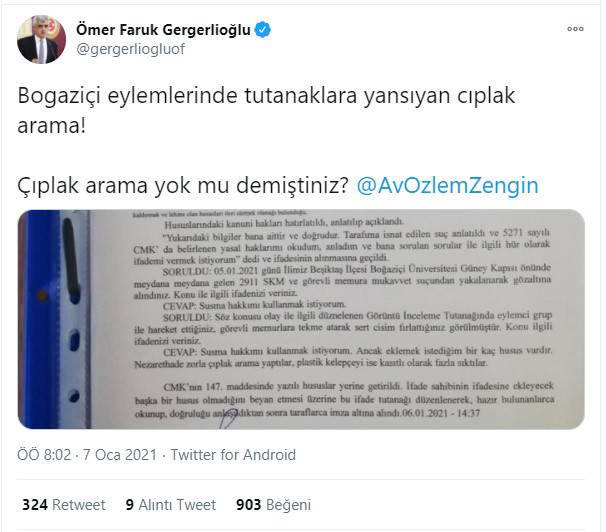 Tutanağı sosyal medya hesabından paylaşan HDP Kocaeli Milletvekili Ömer Faruk Gergerlioğlu, "çıplak arama yoktur" diyen AKP Grup Başkanvekili Özelm Zengin'e seslenerek, "Çıplak arama yok mu demiştiniz?" ifadesini kullandı.