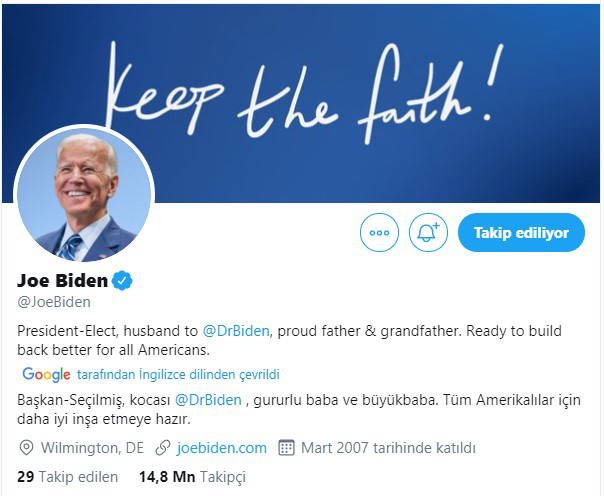 Joe Biden, açıklanan sonuçların ardından resmi Twitter adresindeki biyografi bölümüne, "Seçilmiş Başkan" yazdı. Biden'ın biyografisinde, "gururlu baba" ve "büyük baba" ifadelerinin yanında, "Tüm Amerikalılar için daha iyi inşa etmeye hazır" notu da yer alıyor.