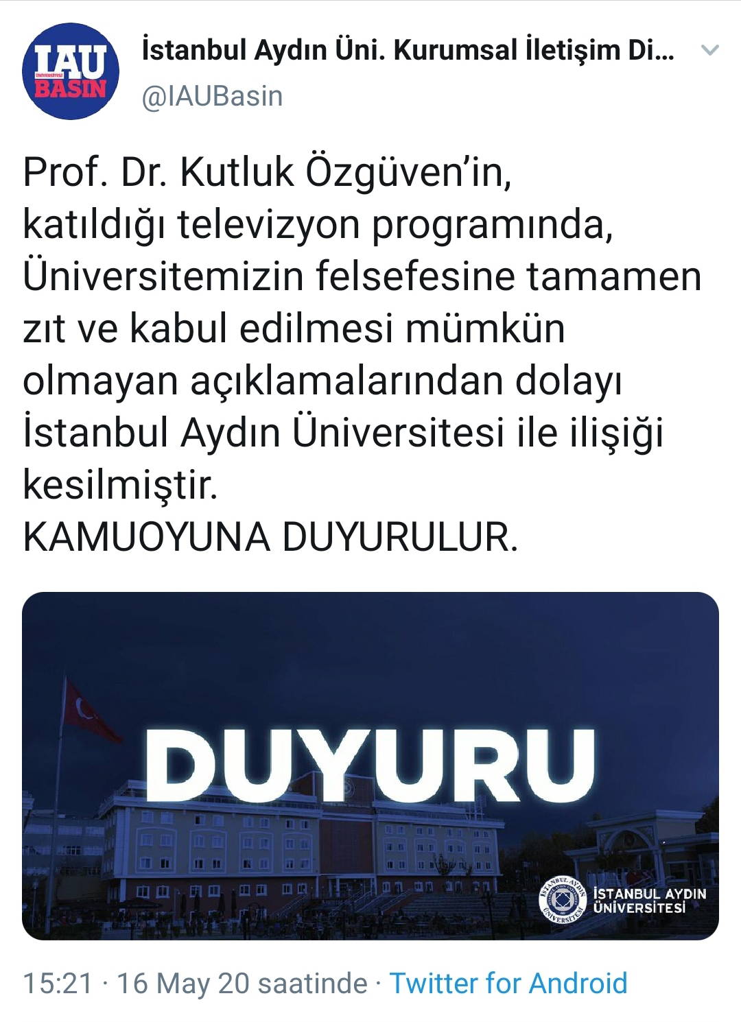 "Prof. Dr. Kutluk Özgüven’in, katıldığı televizyon programında, Üniversitemizin felsefesine tamamen zıt ve kabul edilmesi mümkün olmayan açıklamalarından dolayı İstanbul Aydın Üniversitesi ile ilişiği kesilmiştir. KAMUOYUNA DUYURULUR."