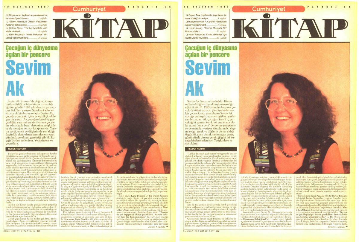“1985 yılından bu yana çocuk öyküleri yazıyor Sevim Ak. Şimdiye kadar sekiz çocuk kitabı yayımlanan Sevim Ak , çocuğa yumuşak, içten ve eşitlikçi yaklaşan bir yazar. Ak, çocuğun kendi iç gerçekliğini yansıtırken kimi zaman çocuklar adına “anla beni” dercesine yetişkinlere de mesajlar veriyor kitaplarında. Yaşamı, sevgi, emek ve düşlerin de yer aldığı özgürlük alanı olarak tanımlayan yazar, günümüzde olması gerektiği gibi iki kuşağa birden sesleniyor: yetişkinlere ve çocuklara.”