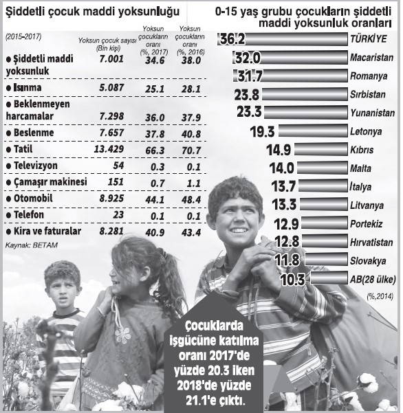 Bahçeşehir Üniversitesi Ekonomi ve Toplumsal Araştırmalar Merkezi’nin (BETAM) araştırmasına göre, Türkiye’de yaklaşık her üç çocuktan biri, başka bir deyişle 7 milyondan fazla çocuk şiddetli maddi yoksunluk çeken hanelerde yaşıyor. Uzun süren gelir yoksulluğunun bir sonucu olan maddi yoksunluk, yetişkinlerde geçici olabilirken çocuklarda genelde ömür boyu sürüyor ve sonraki nesillere aktarılma riski taşıyor. Türkiye’de yaşayan çocukların yüzde 74.6’sı evden uzakta bir haftalık tatil masrafını karşılayamayan hanelerde yaşıyor. Çocukların yüzde 51.3’ü son 12 ay içerisinde ev kirasını, elektrik, su, gaz ve kredi kartı faturalarını planladığı gibi ödeyemeyen hanelerde ikamet ediyor.