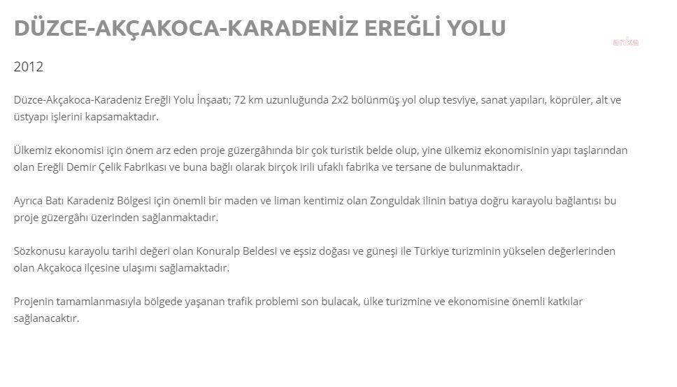 "Düzce-Akçakoca-Karadeniz Ereğli Yolu İnşaatı; 72 km uzunluğunda 2x2 bölünmüş yol olup tesviye, sanat yapıları, köprüler, alt ve üstyapı işlerini kapsamaktadır.