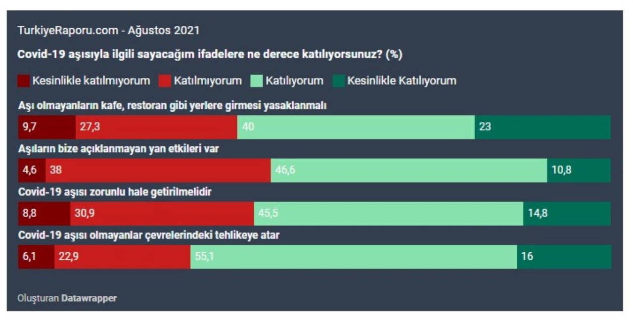 Yurttaşların aşılanmamasında yerli aşının üretilmemesinin de etkisi olduğu vurgulanırken, bu tür güven kırıcı sebeplerin süreci engellediği belirtildi. Yapılan Covid-19 anketinde ise şu sonuçlar elde edildi: