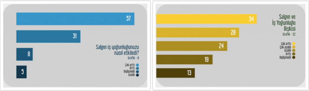 Daha uzun ve yoğun çalışma: Salgın döneminde market çalışanları ve motosikletli kuryelerin çalışma koşulları ağırlaştı, çalışma saatleri uzadı. Bu dönemde market çalışanlarının günde ortalama 9,55 saat çalıştığı görüldü. Ama bu durum çalışanların ücretlerine yansımadı; öte yandan her iki çalışan grubunun da harcamaları salgın sürecinde arttı.