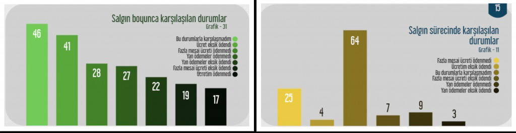 İş saatlerini kısaltma talebi: Her iki çalışan grubunda da en çok karşılaşılan hak gasplarının başında fazla mesai ücretlerinin ödenmemesi ve ücretin eksik ödenmesi geliyor. İşçiler salgın döneminde patrondan en çok iş saatlerinin kısaltılması talebinde bulundu; ancak bu talepleri büyük ölçüde karşılanmadı.
