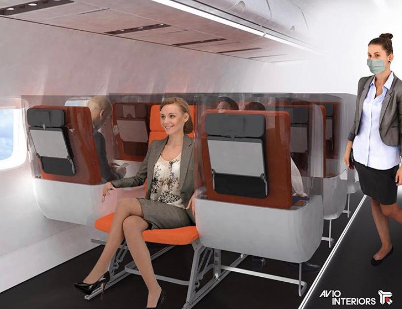 Aviointeriors’ın Instagram hesabından yayımladığı “Janus” koltuk tasarımında, koronavirüsün yayılma riskini azaltmak için yolcular arasına cam bölmeler konduğu görüldü.