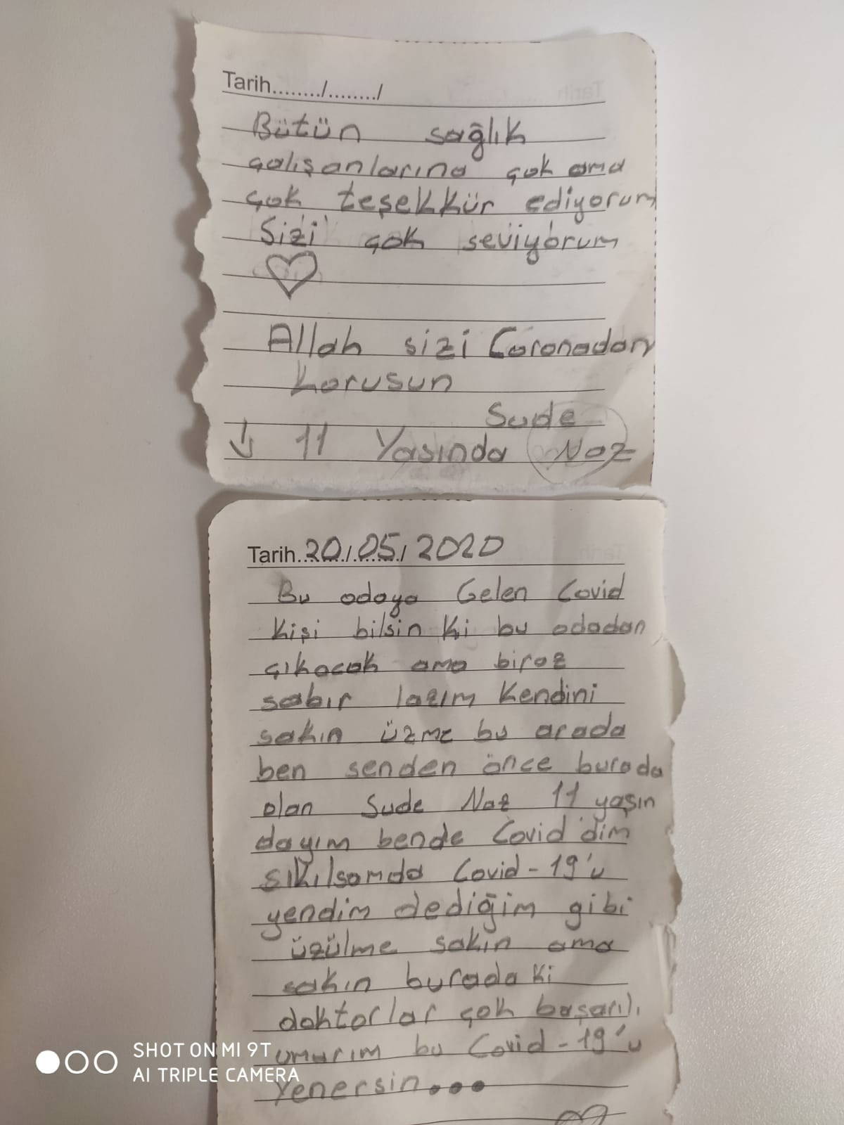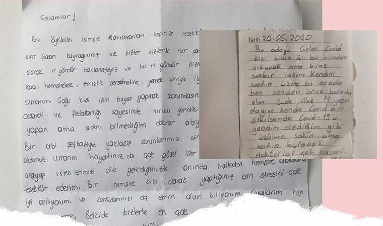 11 yaşındaki Sude Naz Çetin de ayrılırken odasına not bıraktı. Sude Naz Çetin'in, mektubunda sağlık çalışanlarının kendisine kardeşleri, çocukları gibi davranmaları nedeniyle çok duygulandığını, zorlu tedavi sürecini bu sayede kolay atlattığını dile getirerek, odaya kendisinden sonra gelecek hastaya da moral vermeye çalışması herkesi duygulandırdı. Çetin, "Bu odaya gelen koronavirüslü kişi bilsin ki bu odadan çıkacak. Ama biraz sabır lazım. Kendini sakın üzme. Sıkılsam da koronavirüsü yendim, dediğim gibi üzülme sakın. Buradaki doktorlar çok başarılı" ifadesini kullandı.