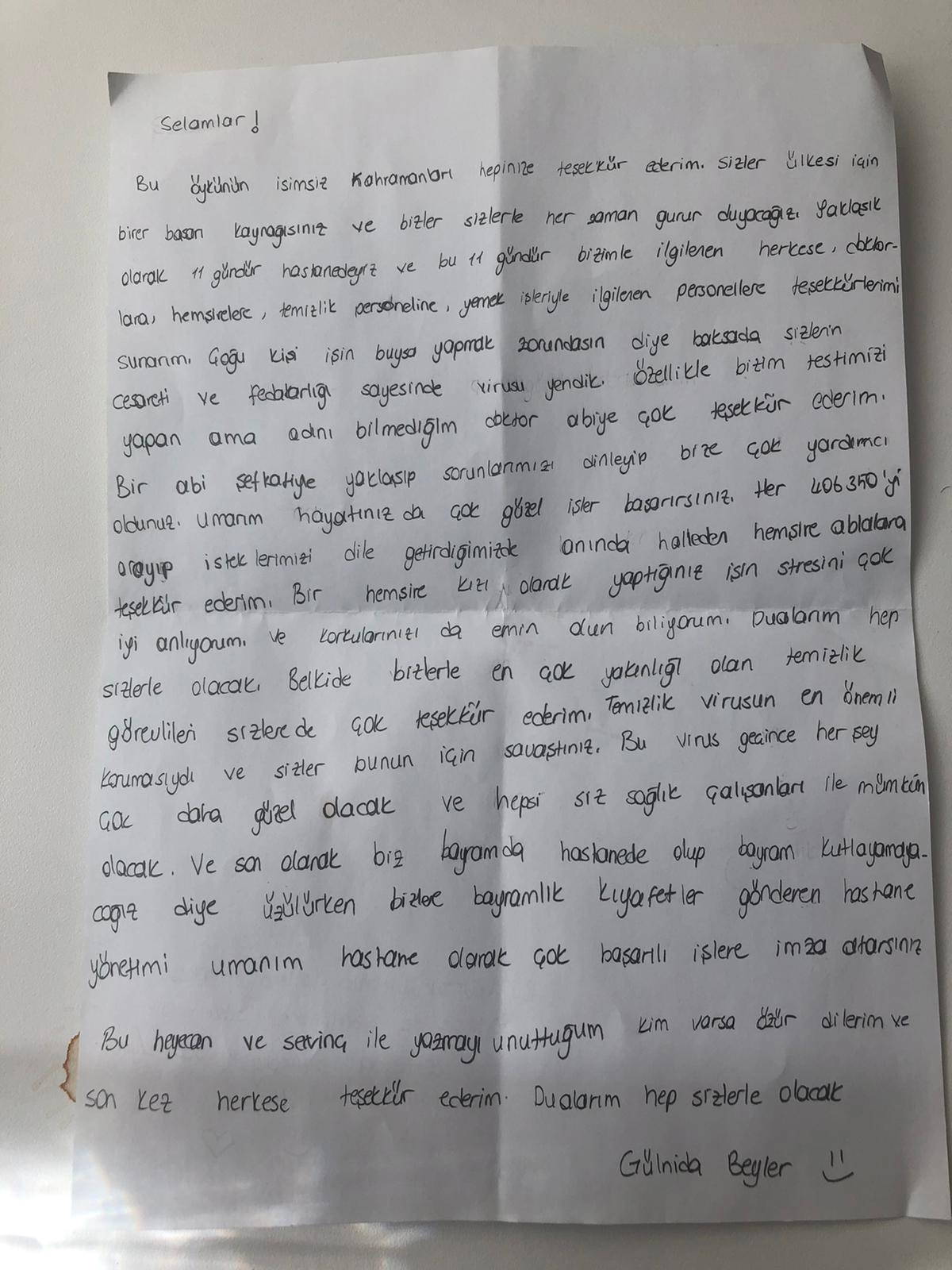 Üniversiteye giriş sınavına hazırlanan ve anne babası da sağlık çalışanı olan Gülnida Beyler mektubunda, pandemi sürecinde fedakarca çalışan sağlık çalışanlarına minnet duyduğunu ifade etti. Beyler, hastaneye ilk yatışındaki tedirginliğinin klinikte kendisine gösterilen ilgi ve şefkat sayesinde yerini hastalığı yenme motivasyonuna dönüştüğünü dile getirdi. Beyler, tedavi sürecinde tüm kurallara uyarak hastalığı yendiğini ve bunda ona sürekli moral veren klinik çalışanlarının payının büyük olduğunu anlattı.