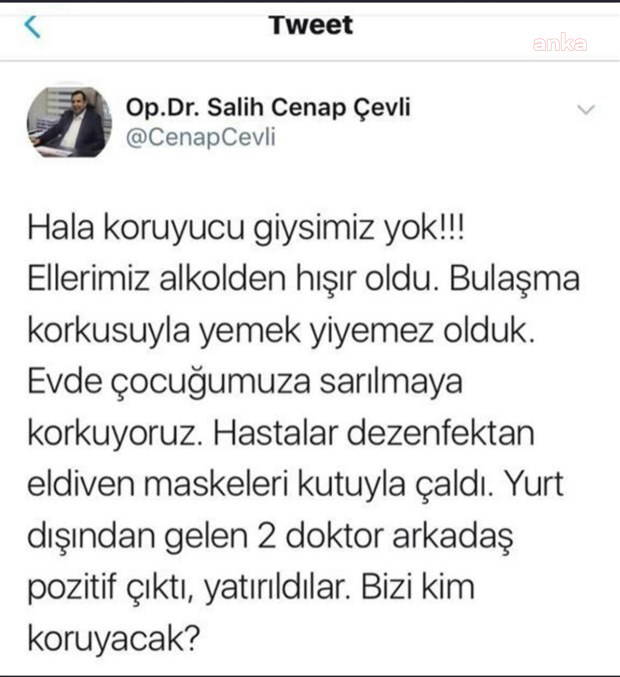 Sosyal medya hesabı üzerinden, "Hala koruyucu giysimiz yok. Alkolden ellerimiz hışır oldu. Bulaşma korkusuyla yemek yiyemez olduk. Evde çocuklarımıza sarılmaya korkuyoruz. Bizi kim koruyacak" sözleri ile isyan eden Doktor Çevli’nin hastanede kaptığı Covid-19 nedeniyle yaşamını yitirmesi büyük üzüntü yaratmıştı. Doktor Çevli’nin vefatının ardından, geriye eşi ve birisi engelli olan üç çocuğu kaldı.