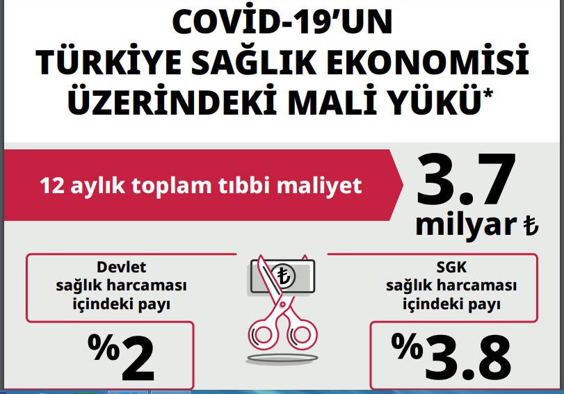 Türkiye’de Pandemi ile ilgili tüm sağlık harcamaları devlet tarafından karşılanıyor. Araştırmaya göre, Covid-19 nedeniyle yatarak ve ayaktan tedavi alan hastaların toplam tedavi maliyetinin devlet sağlık harcamalarında yüzde 2.0 ve SGK sağlık harcamalarında yüzde 3.8’lik bir oranı oluşturduğu tahmin ediliyor.