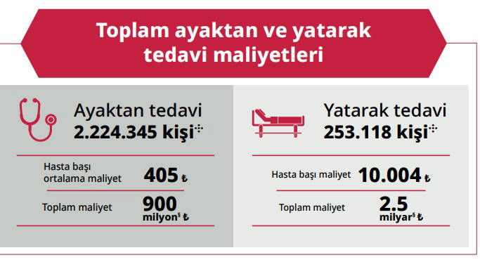 Araştırmaya göre, 11 aylık sürede toplam 2 milyon 477 bin 463 hasta yatarak ve ayaktan tedavi gördü. Bu hastaların ülkemize direkt tıbbi maliyeti toplam 3 milyar 433 bin TL oldu. 11 aylık verilerden yola çıkılarak Covid-19’un 12 aylık direkt tıbbi maliyet yükü ise tahmini 3 milyar 745 bin TL olarak hesaplandı. Maliyet yükü araştırması yapılırken sadece test, tanı, tedavi, ilaç gibi direkt tıbbı maliyetler dikkate alındı.