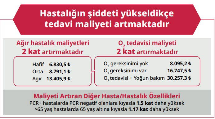 - Hastalığın şiddeti arttıkça maliyetlerin de arttığı tespit edildi. Şiddetli Covid-19 hastalarında ortalama maliyetler, belirti göstermeyen, hafif şiddetli ve orta derece şiddetli Covid-19 maliyetlerinden çok daha yüksek gerçekleşti.