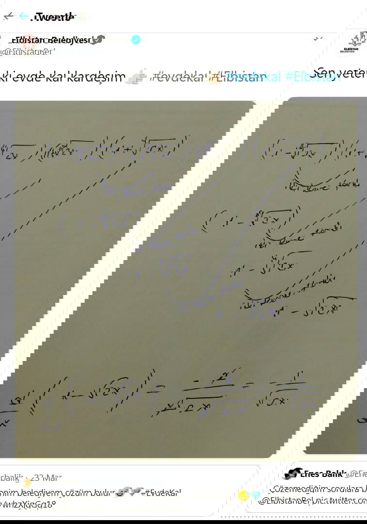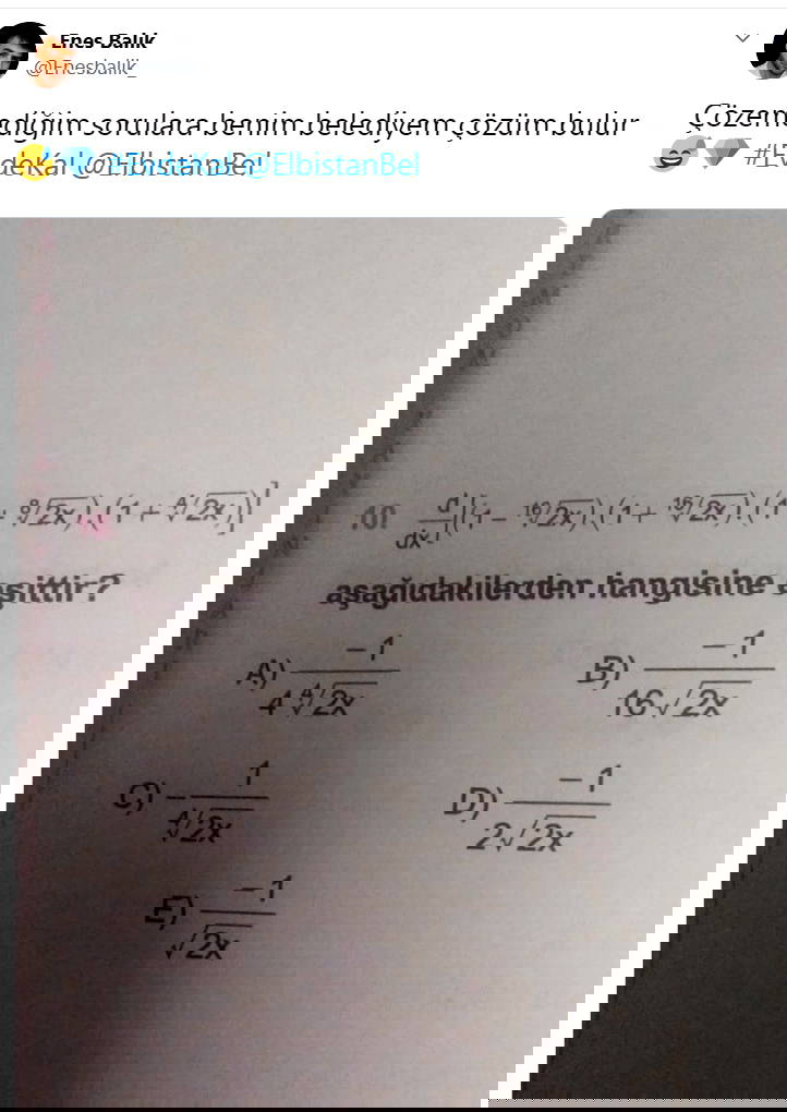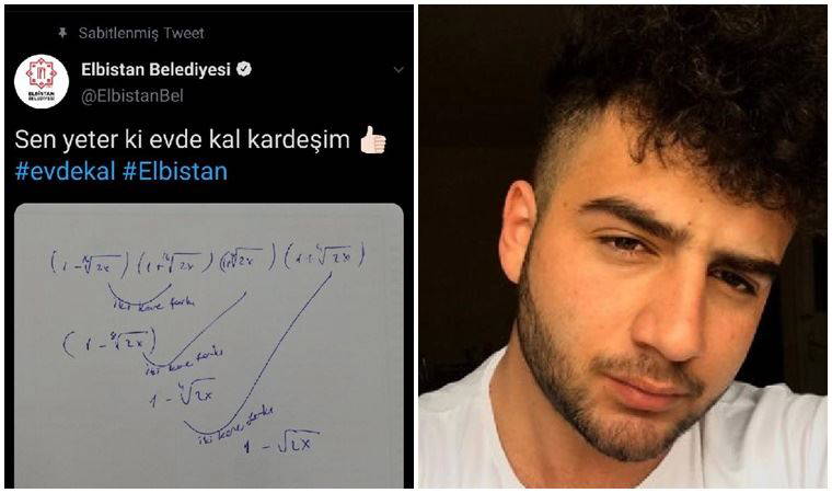 Koronavirüs tedbirleri kapsamında evde kalarak üniversite sınavına hazırlanan Enes Balık, bir matematik sorusunu çözemedi. Balık, sorunun çözümü için Elbistan Belediyesi'nden yardım alabileceğini düşünerek sorunun fotoğrafını "Çözemediğim sorulara benim belediyem çözüm bulur" notuyla Twitter'da paylaşıp, Elbistan Belediyesi'ni etiketledi.