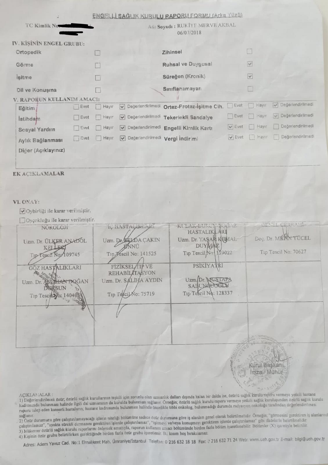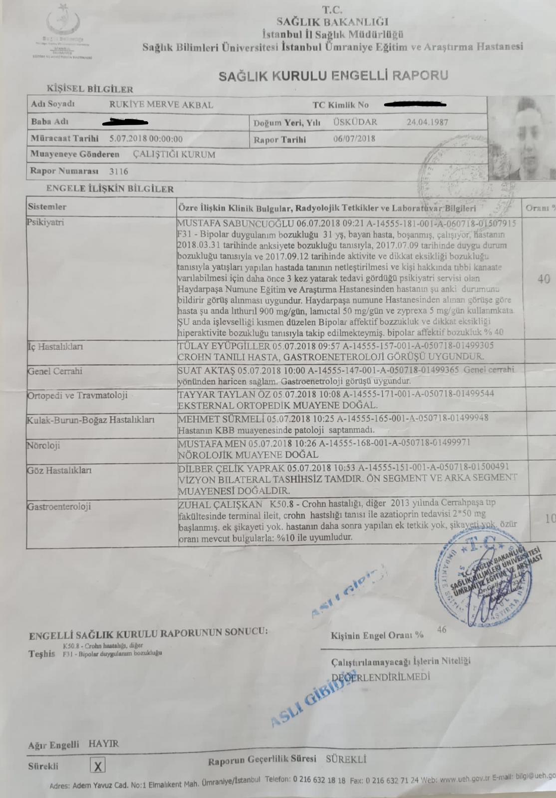 Merve Akbal'ın Crohn hastası olduğunu gösteren devlet hastanesi raporu