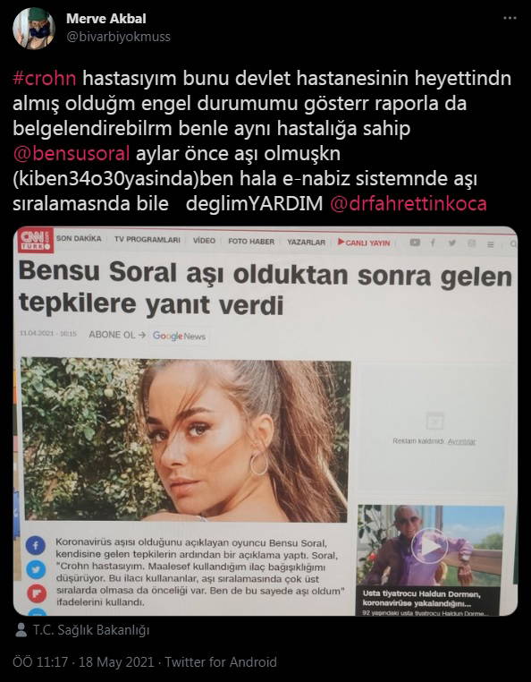 Crohn hastası Merve Akbal, sosyal medya hesabı Twitter’dan Sağlık Bakanı Fahrettin Koca’ya seslendi. Kendisinin hastalık kapsamında belirtilen ilaçları kullanmasına rağmen, aşı sıralamasında öncelik kapsamında bile görünmediğini belirten Akbal; Bakan Koca’ya, kendisi gibi Crohn hastası olan ve geçtiğimiz haftalarda Covid-19 aşısı yaptıran oyuncu Bensu Soral’ı hatırlattı.