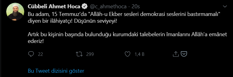 "Bu adam, 15 Temmuz'da 'Allâh-u Ekber sesleri demokrasi seslerini bastırmamalı' diyen bir ilâhiyatçı! Düşünün seviyeyi! Artık bu kişinin başında bulunduğu kurumdaki talebelerin îmanlarını Allâh’a emânet ederiz!"