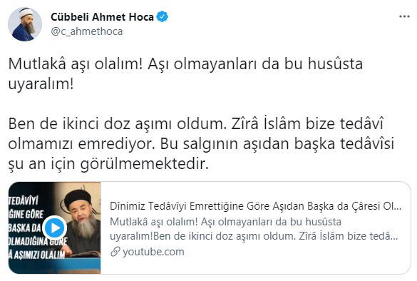 Kamuoyunda "Cübbeli Ahmet" olarak bilinen Ahmet Mahmut Ünlü, aşı tartışmalarına katıldı.