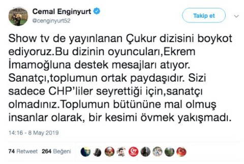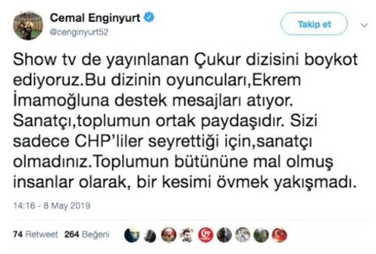 MHP Ordu Milletvekili Cemal Enginyurt, Ekrem İmamoğlu'nun çağrısına destek veren Çukur dizisinin oyuncularını eleştirerek, "Show TV'de yayınlanan Çukur dizisini boykot ediyoruz Bu dizinin oyuncuları,Ekrem İmamoğlu'na destek mesajları atıyor." dedi.