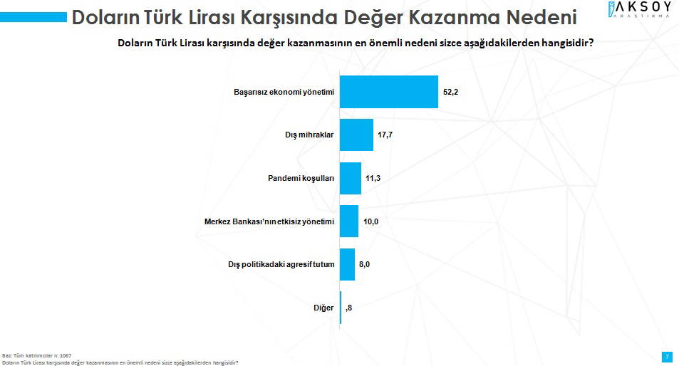 Aksoy Araştırma’nın dijital paneli ile 26 Ekim tarihinde Türkiye genelinde 1067 kişinin katıldığı araştırmada, katılımcıların %50,5’i önümüzdeki aylarda doların artacağını, %27,3’ü ise çok artacağını beklediğini belirtti. Toplamda seçmenin %77,8’i Türk Lirasının dolar karşısındaki değer kaybının sürmesini beklediğini ifade etti. Bu oran AKP seçmeninin %71,3’ünü oluştururken MHP seçmeninde ise %86 oldu. Araştırmada “Türk Lirasının Dolar karşısında değer kaybının en önemli nedeni nedir?” sorusuna “başarısız ekonomi yönetimi” diyenlerin oranı %52,2, “dış mihraklar” ise %17,7 oranında oldu.