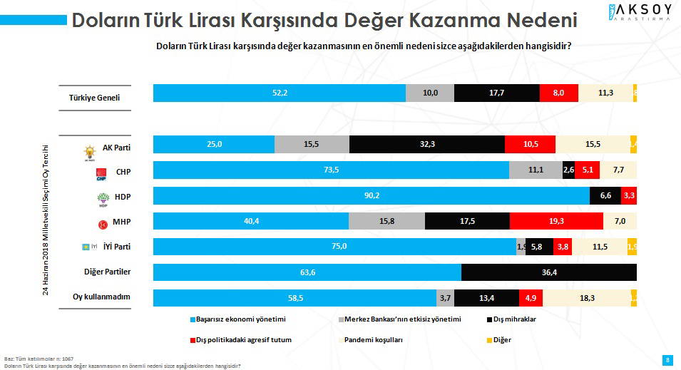 Dolardaki artışın sebebinin ekonomi yönetiminin başarısızlığına bağlayanlar, AKP ve MHP seçmeninin de önemli bir kısmını oluşturdu. Buna göre 24 Haziran 2018 seçimlerinde AKP’ye oy vermiş olanların yüzde 25’i başarısızlığı sebep gösterirken yüzde 15’i Merkez Bankası’nın etkisiz yönetimine bağladı.