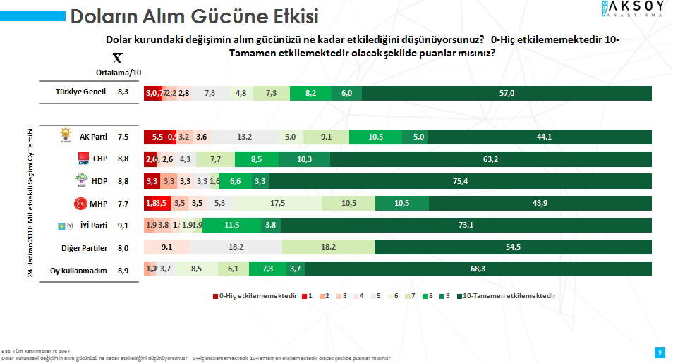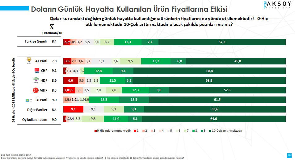 AKP ve MHP seçmenlerinin bu iki soruya yanıtı yine hayli çarpıcı oldu. AKP seçmenlerinin yüzde 44’ü dolar artışının ürün fiyatlarını çok artırdığını belirtirken yüzde 45’i bu durumun günlük alım gücünü etkilediğine dikkat çekti. MHP seçmeninin ise yüzde 43.9’u kurdaki artışın alım gücünü etkilediğini dile getirirken yüzde 50’dan fazlasını oluşturan bölümü artışın ürün fiyatlarını çok artırdığını düşündüğünü ifade etti.