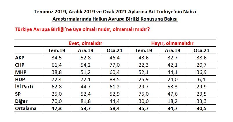Ankette kendisini AKP'li olarak tanımlayan vatandaşların "Türkiye, AB'ye üye olmalı mıdır, olmamalı mıdır?" sorusuna Temmuz 2019'da 34,5 "Evet", yüzde 43,6 "Hayır" dedikleri görüldü. Aynı soru Aralık 2019'da sorulduğunda ise 52,8 "Evet", yüzde 32,7 "Hayır" yanıtını verdiler. İktidara oy verenlerde "AB'ye evet" oyları 5 ayda yüzde 20'ye yakın arttı. Bu soruya Ocak 2021'de ise AKP'li seçmenler yüzde 46,4 "Evet", yüzde 38,6 "Hayır" cevabını verdi. Bu iki yıllık sürede AKP seçmeninin AB'ye desteğinin düştüğü gözlemlendi.
