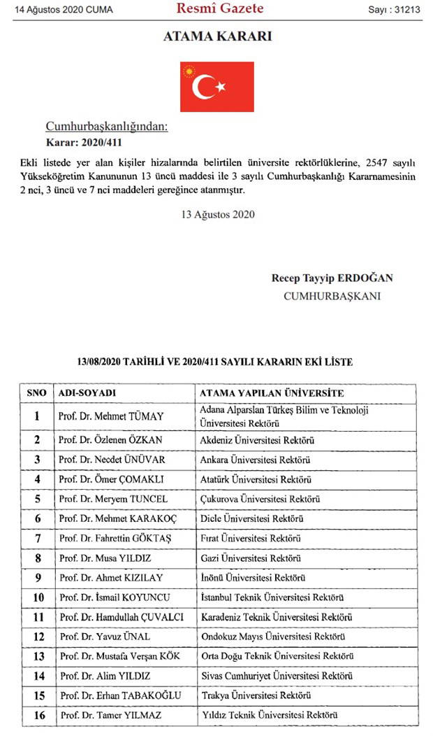 Bu kapsamda, Adana Alparslan Türkeş Bilim ve Teknoloji Üniversitesi Rektörlüğüne Prof. Dr. Mehmet Tümay, Akdeniz Üniversitesi Rektörlüğüne Prof. Dr. Özlenen Özkan, Ankara Üniversitesi Rektörlüğüne Prof. Dr. Necdet Ünüvar, Atatürk Ünversitesi Rektörlüğüne Prof. Dr. Ömer Çommaklı, Çukurova Üniversitesi Rektörlüğüne Prof. Dr. Meryem Tuncel, Dicle Üniversitesi Rektörlüğüne Prof. Dr. Mehmet Karakoç, Fırat Üniversitesi Rektörlüğüne Prof. Dr. Fahrettin Göktaş, Gazi Üniversitesi Rektörlüğüne Prof. Dr. Musa Yıldız, İnönü Üniversitesi Rektörlüğüne Prof. Dr. Ahmet Kızılay, İstanbul Teknik Üniversitesi Rektörlüğüne Prof. Dr. İsmail Koyuncu, Karadeniz Teknik Üniversitesi Rektörlüğüne Prof. Dr. Hamdullah Çuvalcı, Ondokuz Mayıs Üniversitesi Rektörlüğüne Prof. Dr. Yavuz Ünal, Orta Doğu Teknik Üniversitesi Rektörlüğüne Prof. Dr. Mustafa Verşan Kök, Sivas Cumhuriyet Üniversitesi Rektörlüğüne Prof. Dr. Alim Yıldız, Trakya Üniversitesi Rektörlüğüne Prof. Dr. Erhan Tabakoğlu, Yıldız Teknik Üniveristesi Rektörlüğüne Prof. Dr. Tamer Yılmaz atandı.