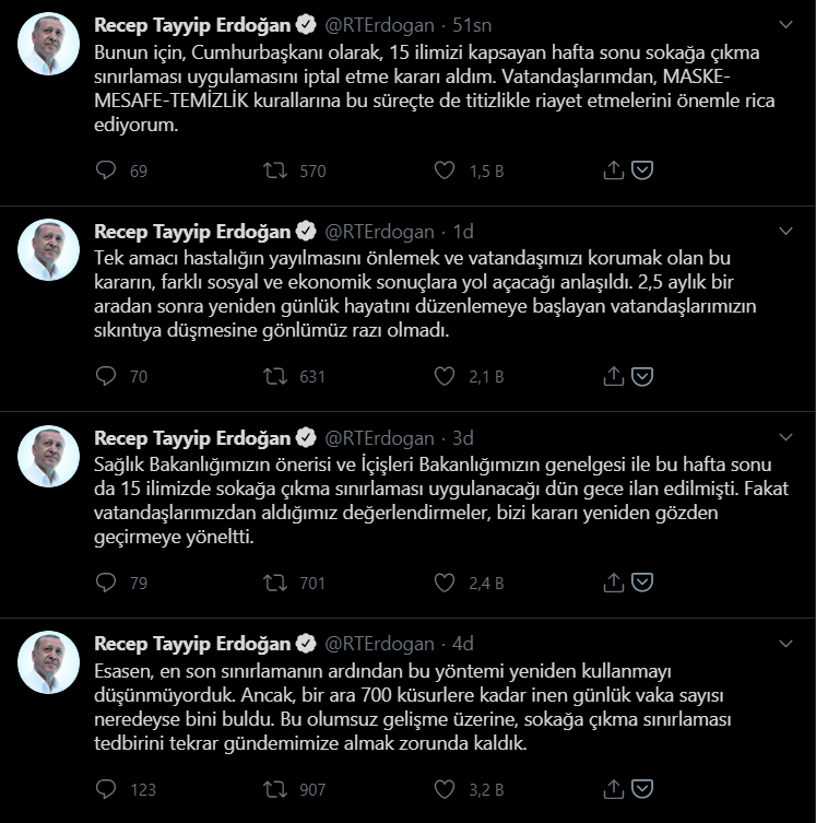 Bunun için, Cumhurbaşkanı olarak, 15 ilimizi kapsayan hafta sonu sokağa çıkma sınırlaması uygulamasını iptal etme kararı aldım. Vatandaşlarımdan, MASKE-MESAFE-TEMİZLİK kurallarına bu süreçte de titizlikle riayet etmelerini önemle rica ediyorum."